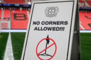 赛前勒沃库森官推曾晒出球场角旗区的趣味标语牌(可能为AI生成):“禁止角球!!!”。